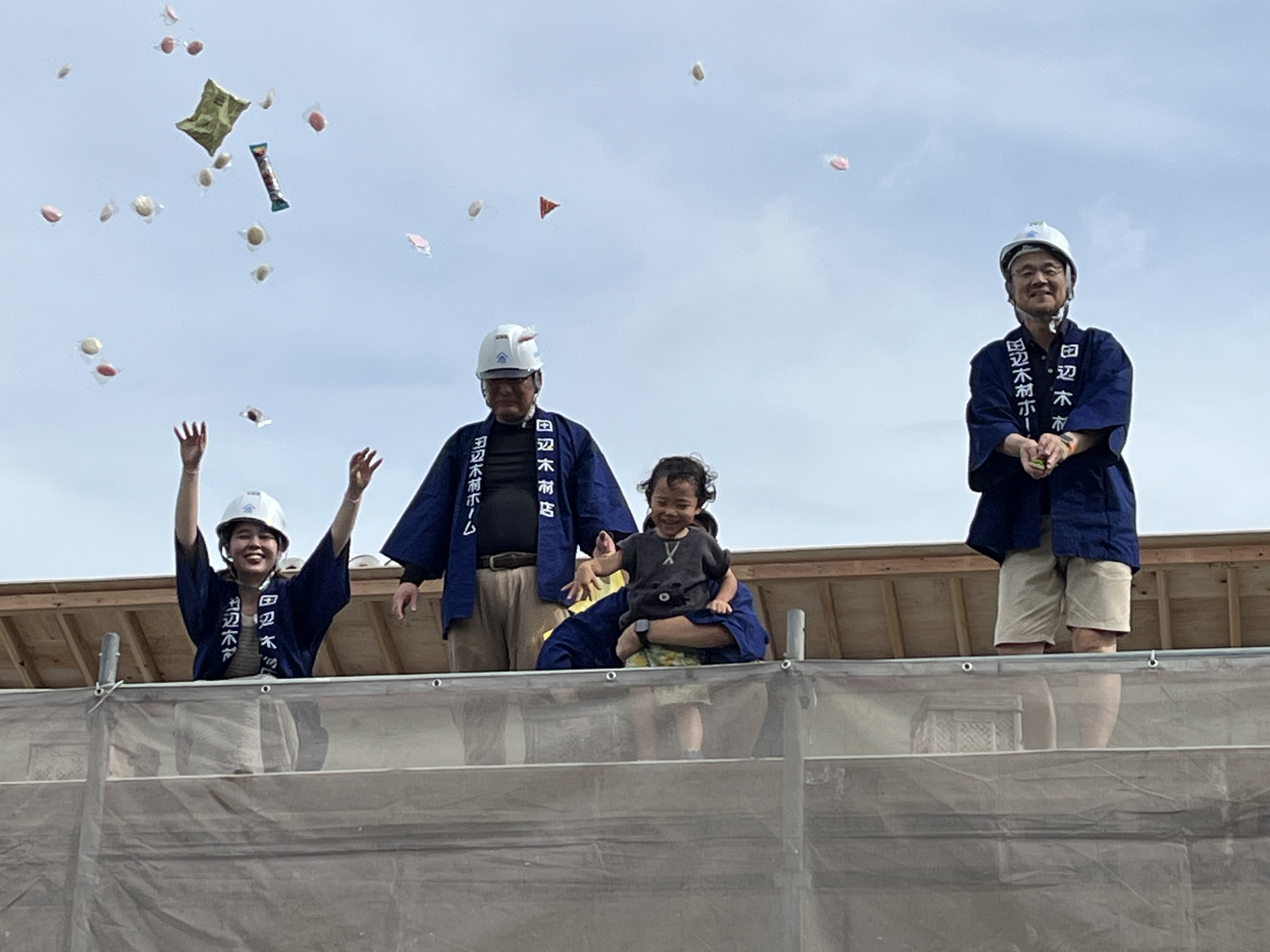 田辺木材ホームでは、上棟時に、餅まきをしたいというお施主様には、「お餅をプレゼント」しています。加えて。お施主様がお菓子などを追加され、餅まきをします!
