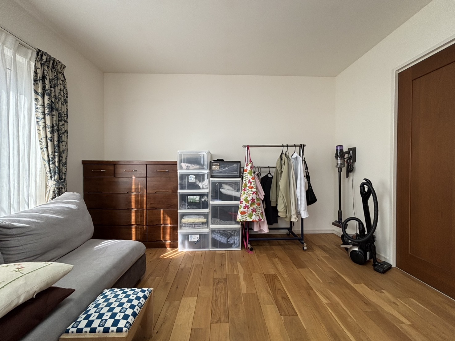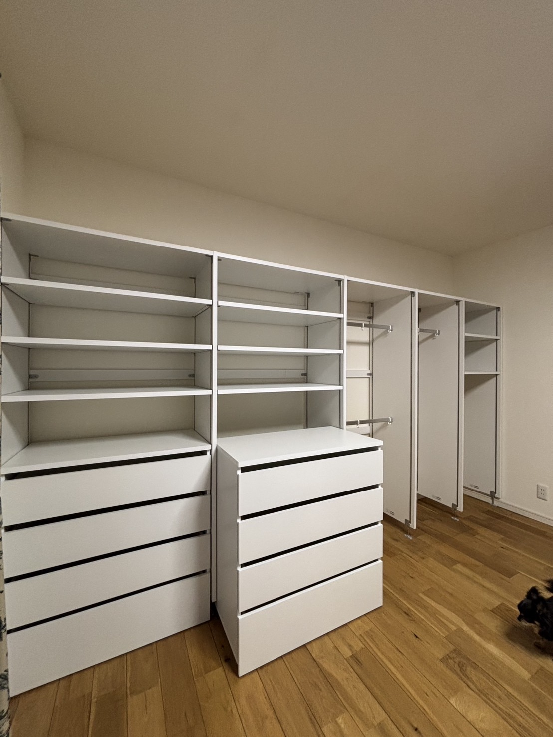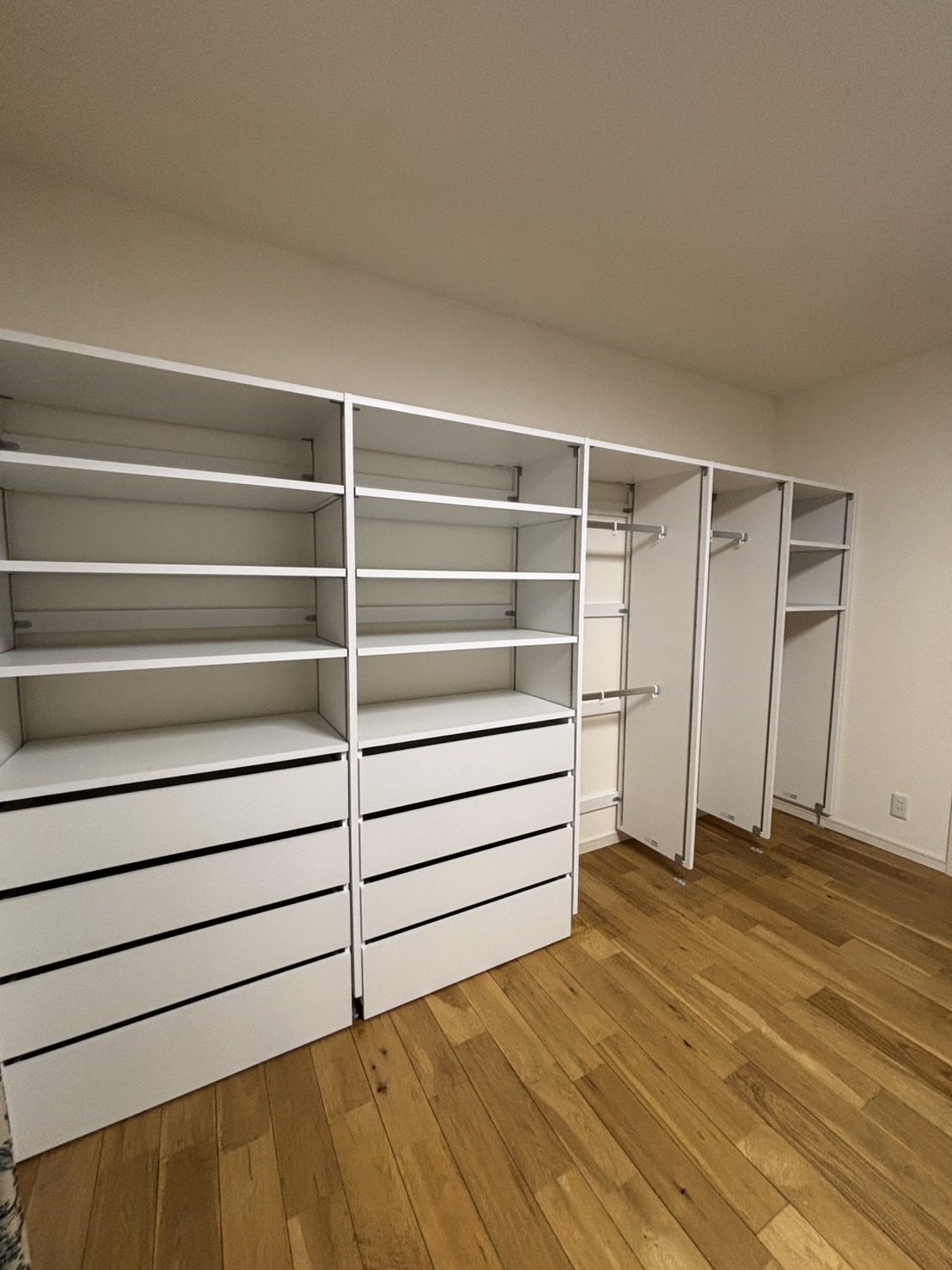引き出しにはコロがついていて、引き出すことができます。一番上には無印良品で蓋つき収納箱を購入予定です。床の掃除ができるのでゴミの掃き溜めにならずに済みそうです。服を収納した様子は次回ご披露します。