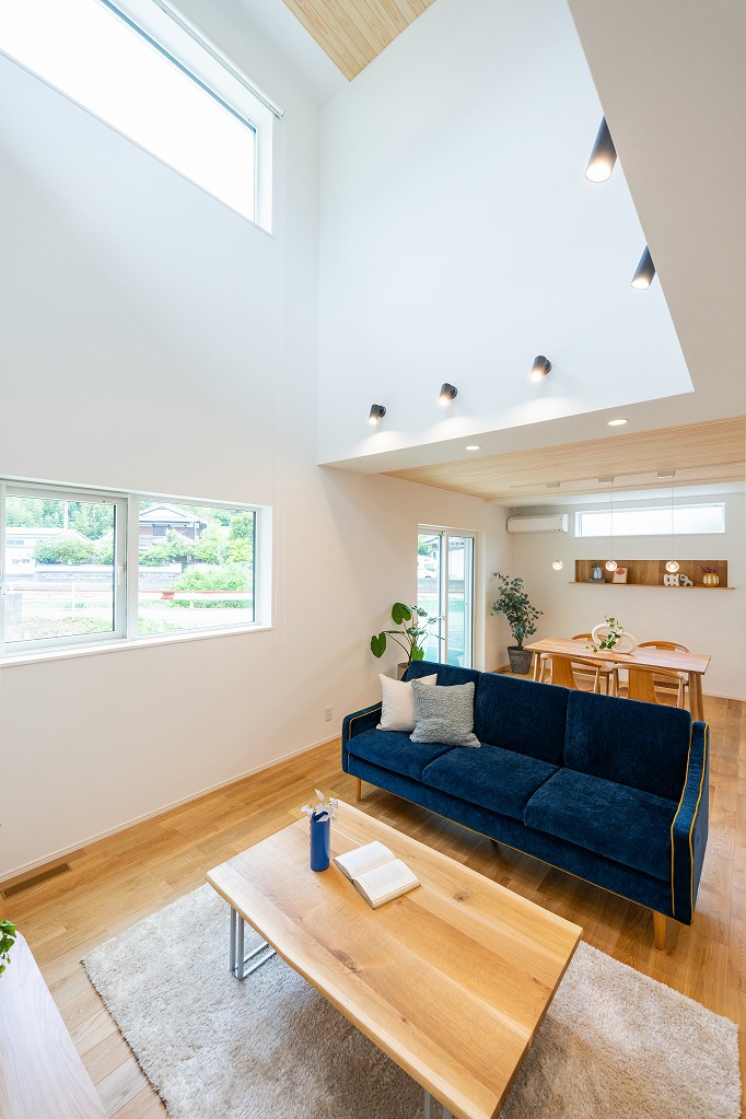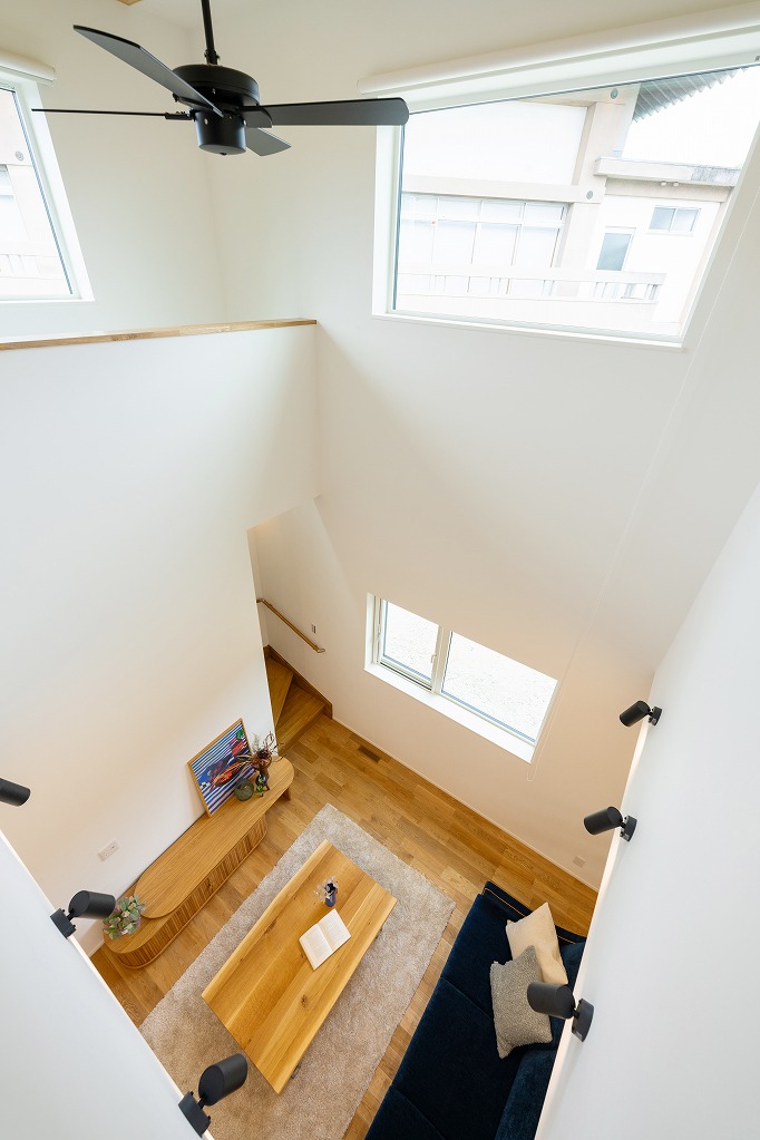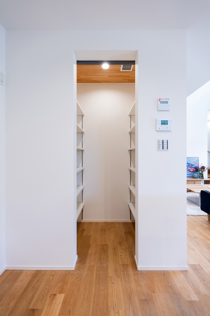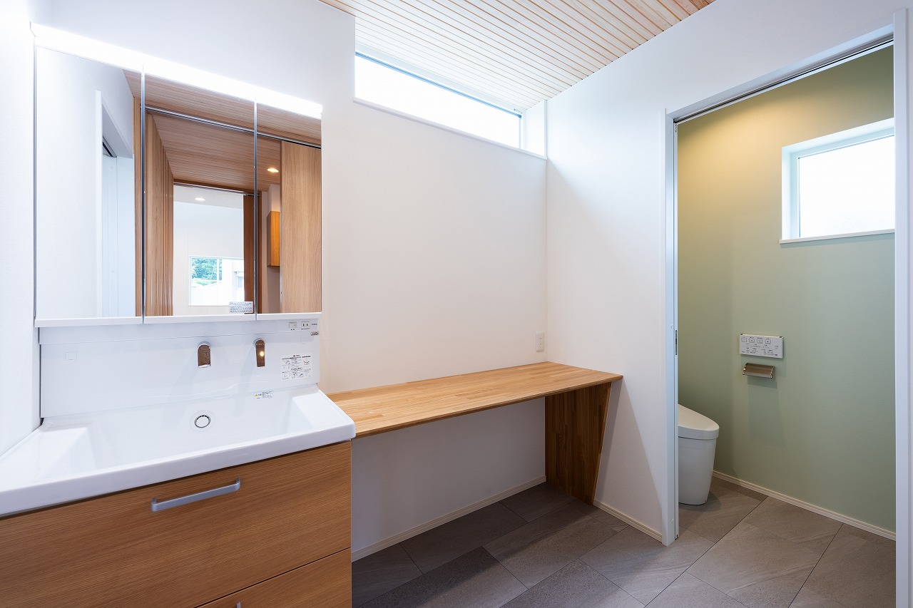 朝起きて2Fの寝室から1Fへ降りるときに吹抜から覗く自然の景色で心が豊かになり素敵な一日が始まりそうな窓や、洗面室と脱衣室で計5.5畳の広々とした空間に設置された集成材の作業台でアイロンがけや洗濯ものがしやすいスペース、使い勝手の良いパントリーなどなど…。
